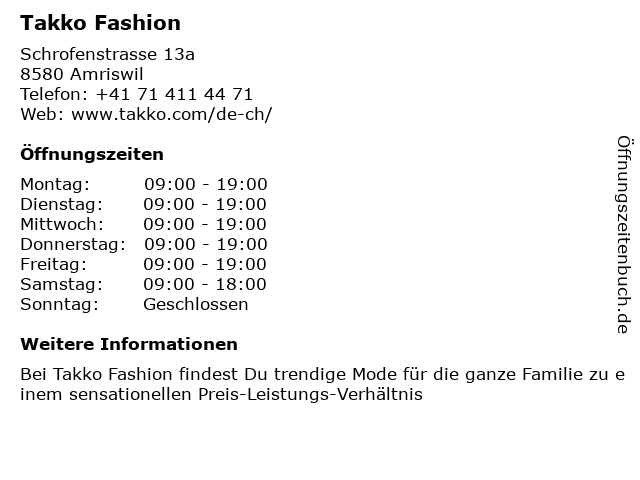 | Öffnungszeiten Takko Fashion in Amriswil anzeigen | |