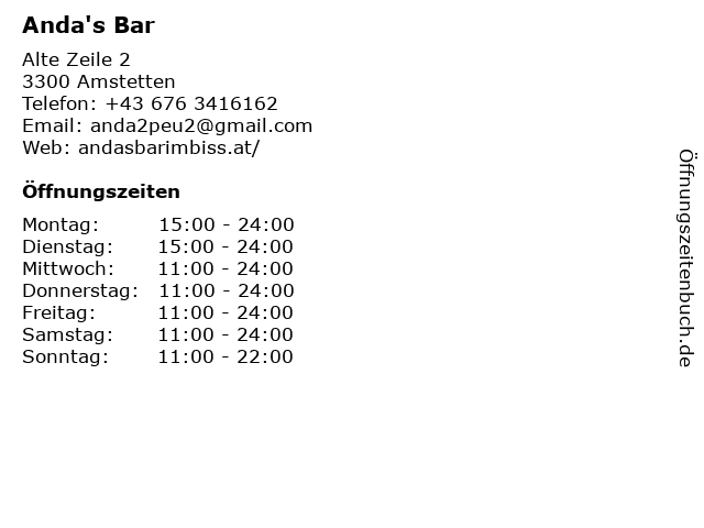 | Öffnungszeiten Anda's Bar in Amstetten anzeigen | |