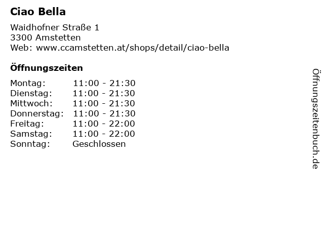 | Öffnungszeiten Ciao Bella in Amstetten anzeigen | |