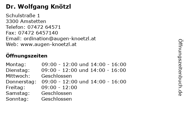 | Öffnungszeiten Dr. Wolfgang Knötzl in Amstetten anzeigen | |