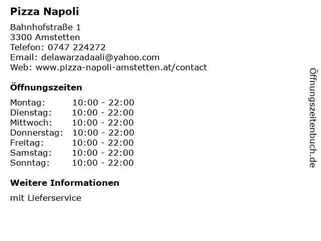 | Öffnungszeiten Pizza Napoli in Amstetten anzeigen | |