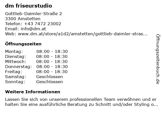 | Öffnungszeiten dm friseurstudio in Amstetten anzeigen | |