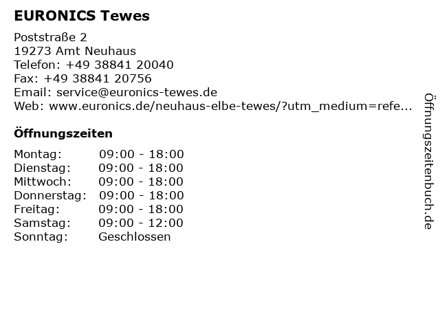 | Öffnungszeiten EURONICS Tewes in Amt Neuhaus anzeigen | |