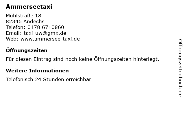 | Öffnungszeiten Ammerseetaxi in Andechs anzeigen | |