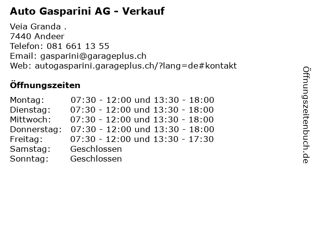 | Öffnungszeiten Auto Gasparini AG - Verkauf in Andeer anzeigen | |