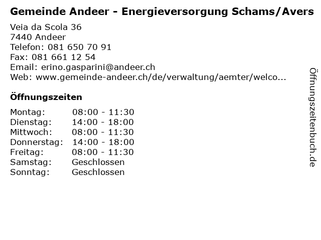 Branchen & Suchbegriffe zu Gemeinde Andeer - Energieversorgung Schams/Avers:amt, andeer, behörde, energieversorgung, gemeinde, schams/avers, verwaltung |