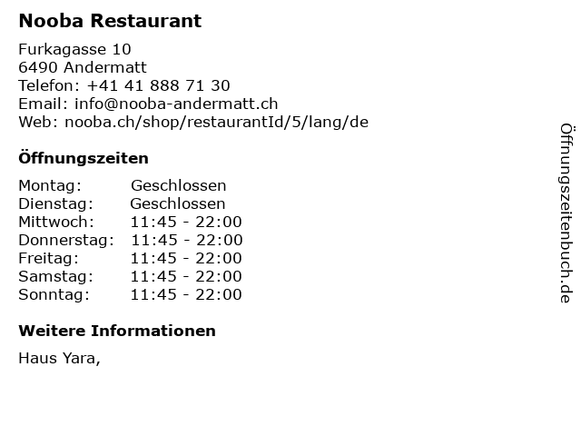 | Öffnungszeiten Nooba Restaurant in Andermatt anzeigen | |