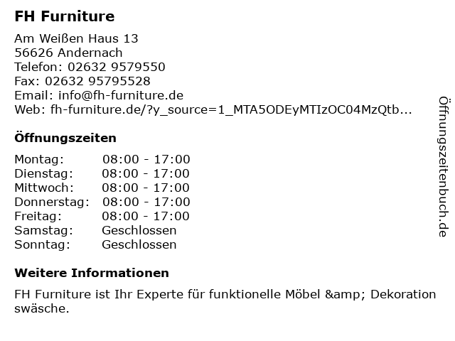 | Öffnungszeiten FH Furniture in Andernach anzeigen | |