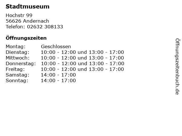 | Öffnungszeiten Stadtmuseum in Andernach anzeigen | |
