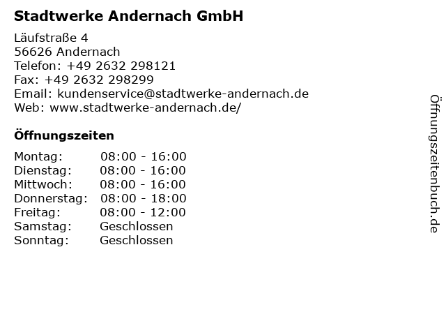 | Öffnungszeiten Stadtwerke Andernach GmbH in Andernach anzeigen | |