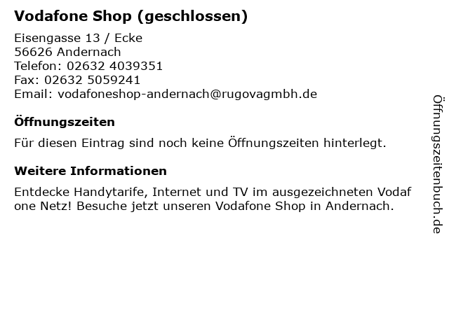 Branchen & Suchbegriffe zu Vodafone Shop (geschlossen):geschlossen, geschäft für handyzubehör, internetanbieter, kabelanschlüsse und satellitenschüsseln, shop, telefonanbieter, vodafone, wlan |