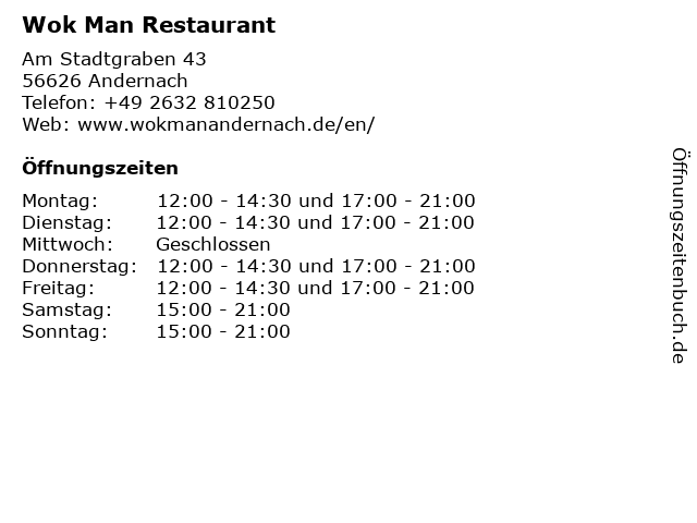 | Öffnungszeiten Wok Man Restaurant in Andernach anzeigen | |