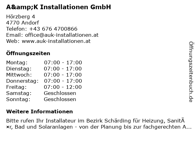 | Öffnungszeiten A&K Installationen GmbH in Andorf anzeigen | |
