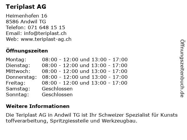 | Öffnungszeiten Teriplast AG in Andwil TG anzeigen | |