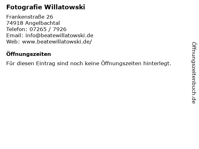 | Öffnungszeiten Fotografie Willatowski in Angelbachtal anzeigen | |