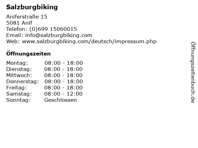 | Öffnungszeiten Salzburgbiking in Anif anzeigen | |