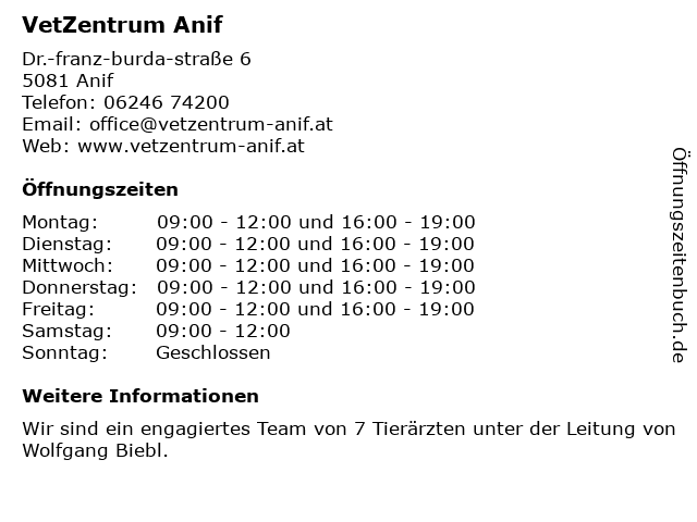 | Öffnungszeiten VetZentrum Anif in Anif anzeigen | |