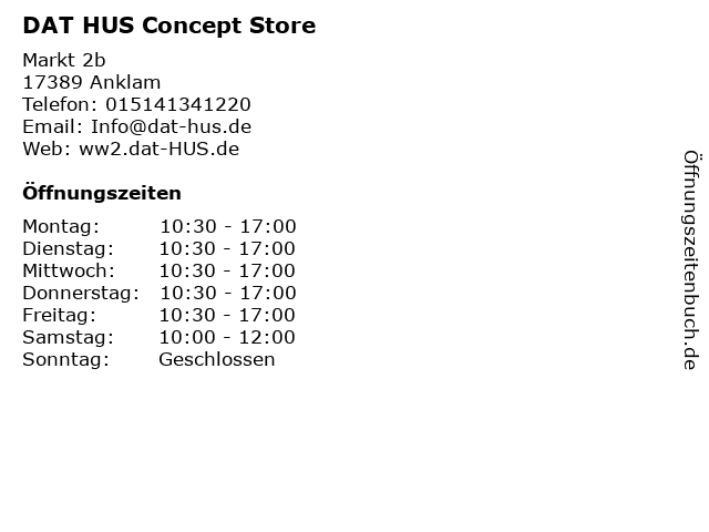 | Öffnungszeiten DAT HUS Concept Store in Anklam anzeigen | |