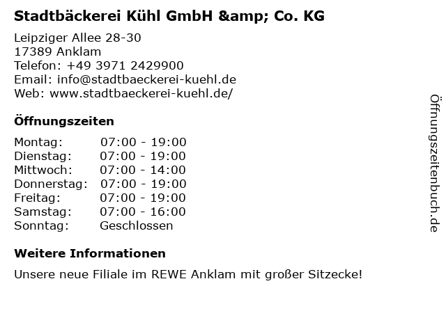 Stadtbäckerei Kühl GmbH & Co. KG in Anklam: Telefonnummer, Öffnungszeiten und Adresse