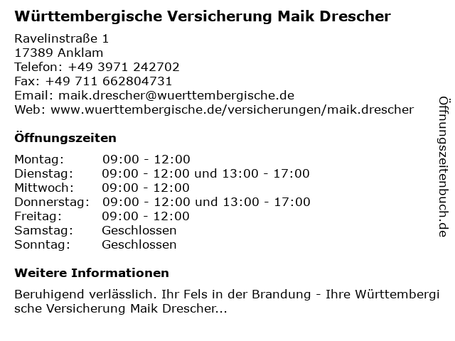 1 Württembergische Versicherung, Gruhlke & Raßmann GbR (Entfernung: 0,01 km) Ravelinstr 1, 17389 Anklam 5 Württembergische Versicherung Winfried Brümmer (Entfernung: 1,85 km) Spantekower Landstr. 35, 17389 Anklam 6 |