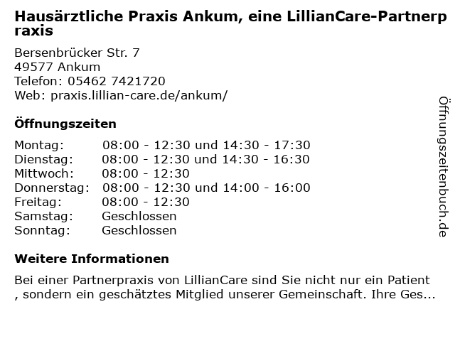 Branchen & Suchbegriffe zu Hausärztliche Praxis Ankum, eine LillianCare-Partnerpraxis:allgemeinärzte, ankum, eine, hausärztliche, lilliancare, medizinisches fachpersonal, partnerpraxis, praxis |