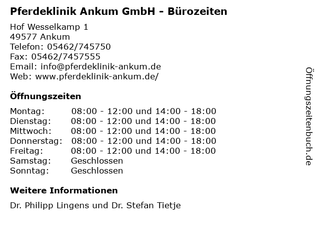 Branchen & Suchbegriffe zu Pferdeklinik Ankum GmbH - Bürozeiten:ankum, bürozeiten, dr., dr. philipp lingens und dr. stefan tietje ankum, lingens, pferdeklinik, philipp, stefan, tierarzt deutschland, tietje |