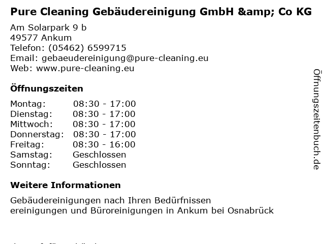 Branchen & Suchbegriffe zu Pure Cleaning Gebäudereinigung GmbH & Co KG:bauabschlussreinigungen, büroreinigungen, cleaning, co, fensterreinigungen, gebäudereinigung, grundreinigung, osmosereinigung, photovoltaikanlagen-reinigung, pure, renigung von terrassendächern, sonderreinigungen, sonderreinigungen mit desinfektion, treppenhausreinigung, unterhaltsreinigung, wintergarten |