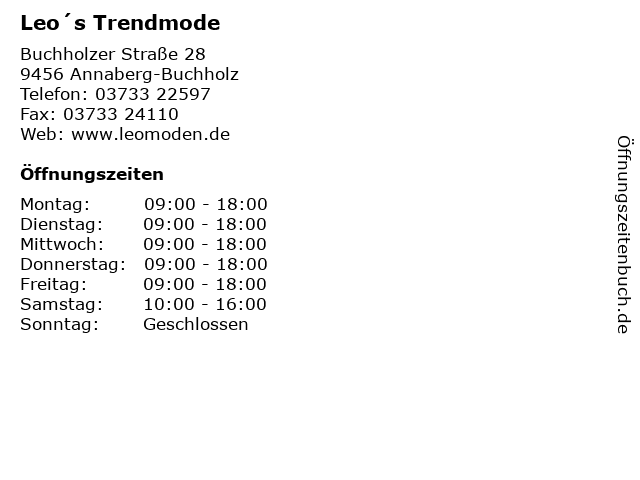 | Öffnungszeiten Leo´s Trendmode in Annaberg-Buchholz anzeigen | |