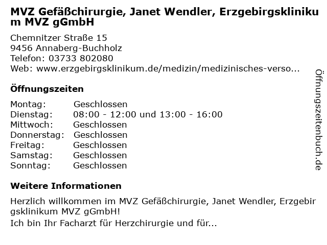 Branchen & Suchbegriffe zu MVZ Gefäßchirurgie, Janet Wendler, Erzgebirgsklinikum MVZ gGmbH:erzgebirgsklinikum, gefäßchirurgie, ggmbh, janet, kardiologie, mvz, wendler |