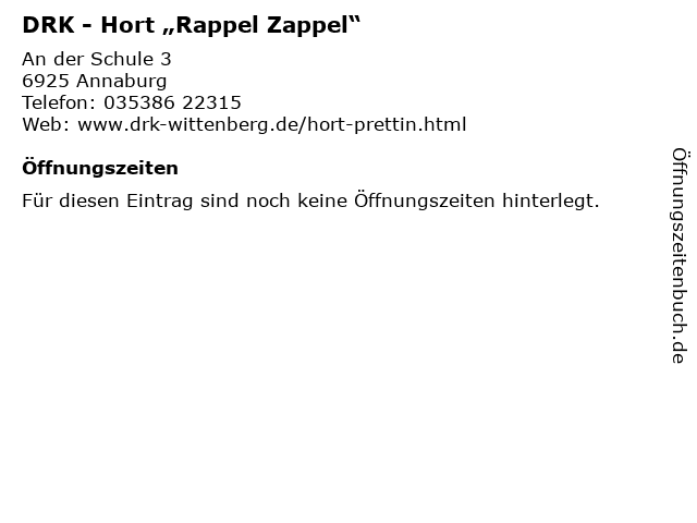 | Öffnungszeiten DRK - Hort „Rappel Zappel“ in Annaburg anzeigen | |