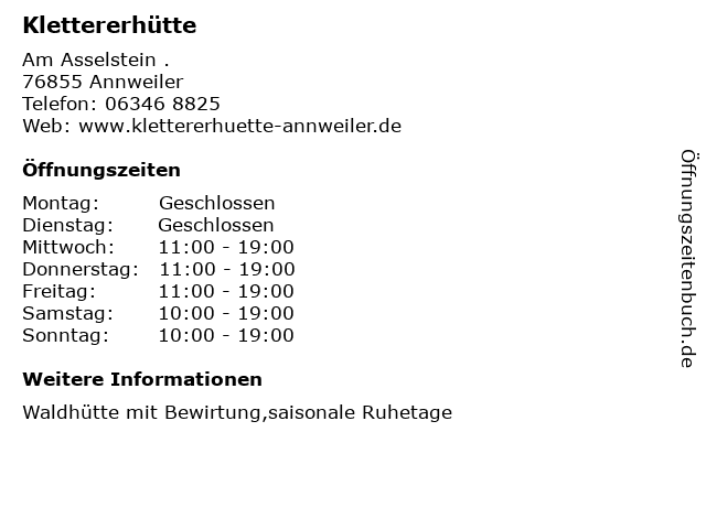 | Öffnungszeiten Klettererhütte in Annweiler anzeigen | |