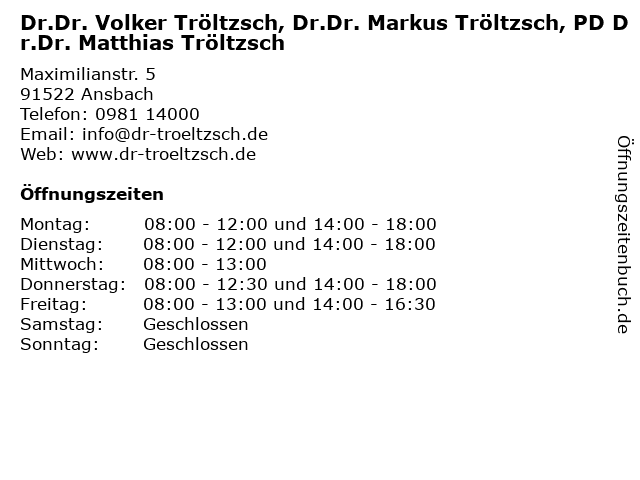 1 Dr. Dr. Tröltzsch - Mund-Kiefer-Gesichtschirurgie (Entfernung: 0,01 km) Maximilianstraße 5, 91522 Ansbach 2 Matthias Heyder Facharzt für Psychiatrie und Psychotherapie (Entfernung: 0,11 km) Rosenbadstr. 5, 91522 Ansbach 6 |
