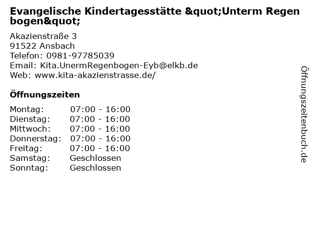 1 Evangelische Kindertagesstätte Heinrich Puchta (Entfernung: 0,82 km) Heinrich-Puchta-Str. 6, 91522 Ansbach 4 Evangelische Kirche - Evangelisch-Lutherische Kirchengemeinde Weidenbach (Entfernung: 9,67 km) Leidendorf 21, 91746 Weidenbach 6  |