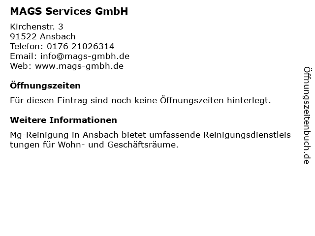 | Öffnungszeiten MAGS Services GmbH in Ansbach anzeigen | |