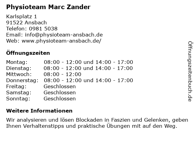 Öffnungszeiten Physioteam Marc Zander in Ansbach anzeigen | |