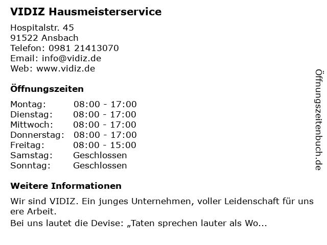 | Öffnungszeiten VIDIZ Hausmeisterservice in Ansbach anzeigen | |