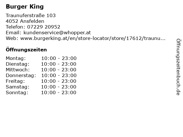 | Öffnungszeiten Burger King in Ansfelden anzeigen | |