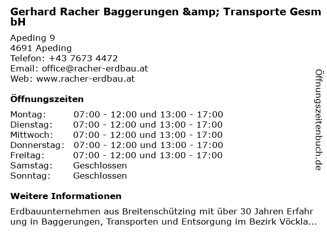 Branchen & Suchbegriffe zu Gerhard Racher Baggerungen & Transporte GesmbH:abbrucharbeiten vöcklabruck, baggerungen, baggerungen oberösterreich, bauschutt entsorgung vöcklabruck, baustoffe wels-land, bauunternehmen vöcklabruck, containerdienst oberösterreich, erdaushub entsorgung breitenschützing, erdbau vöcklabruck, erdbauunternehmen breitenschützing, erdbewegung wels-land, fundamentaushub wels-land, gerhard, gesmbh, güterbeförderung vöcklabruck, humusverkauf vöcklabruck, kelleraushub vöcklabruck, kranarbeiten oberösterreich, racher, recyclingmaterialien wels-land, schotterverkauf oberösterreich, straßenbau vöcklabruck, transporte, transporte wels-land, wegebau wels-land |