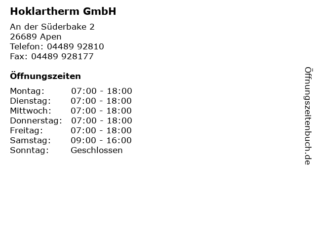 | Öffnungszeiten Hoklartherm GmbH in Apen anzeigen | |