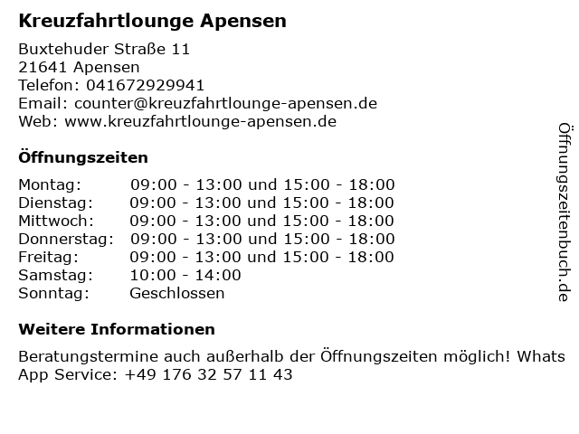 | Öffnungszeiten Kreuzfahrtlounge Apensen in Apensen anzeigen | |