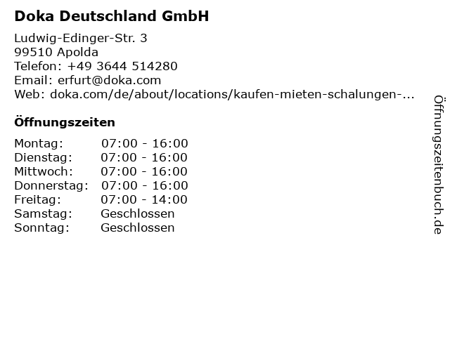 | Öffnungszeiten Doka Deutschland GmbH in Apolda anzeigen | |