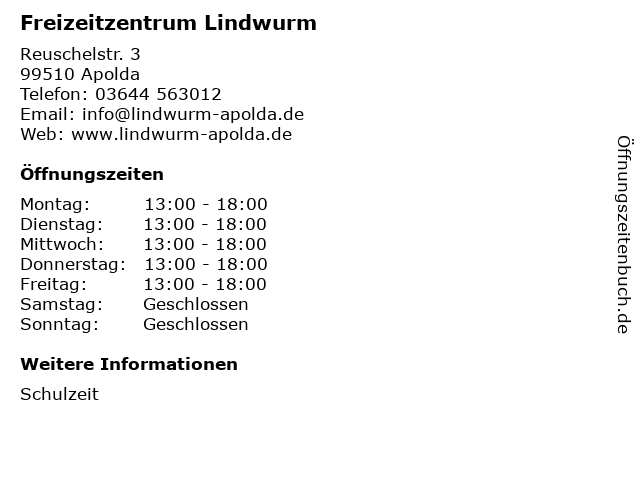 | Öffnungszeiten Freizeitzentrum Lindwurm in Apolda anzeigen | |