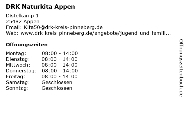 | Öffnungszeiten DRK Naturkita Appen in Appen anzeigen | |