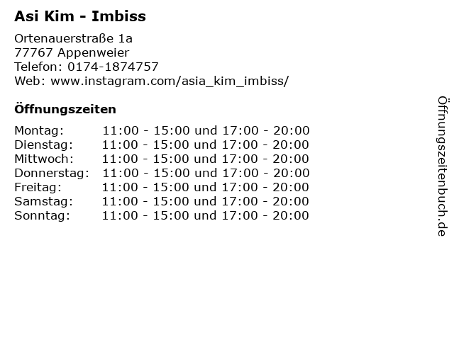 | Öffnungszeiten Asi Kim - Imbiss in Appenweier anzeigen | |