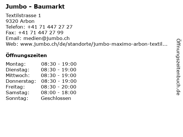 | Öffnungszeiten Jumbo - Baumarkt in Arbon anzeigen | |