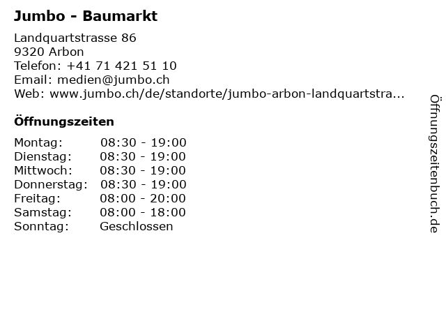 | Öffnungszeiten Jumbo - Baumarkt in Arbon anzeigen | |
