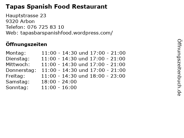 | Öffnungszeiten Tapas Spanish Food Restaurant in Arbon anzeigen | |