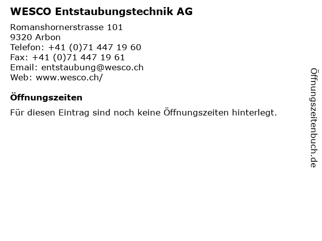 | Öffnungszeiten WESCO Entstaubungstechnik AG in Arbon anzeigen | |