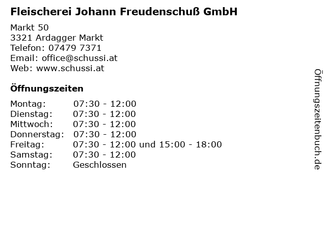 1 Fleischerei Johann Freudenschuß GmbH (Entfernung: 11,56 km) Theresienthalstraße 2, 3363 Ulmerfeld-Hausmening 3 BIO AKTIV Günther Johann Wasser-u. Wärmetechnik GmbH (Entfernung: 5,31 km) Am Burgkogel 17, 3323 Neustadtl an der Donau 6 |