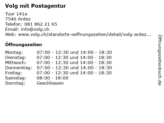 | Öffnungszeiten Volg mit Postagentur in Ardez anzeigen | |